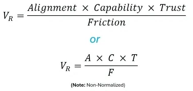 Multiplication in the numerator makes the value drivers (A, C, T) complementary and bottleneck-sensitive. If any of Alignment (A), Capability (C), or Trust (T) is weak, the product drops in proportion, matching how real-world AI programs fail or succeed. For example, adding the variables would falsely imply that we can offset zero Trust with more Engineering. Division by Friction (F) converts organizational drag into a measurable, scale-consistent penalty, keeping the score empirically grounded and comparable across teams and time.